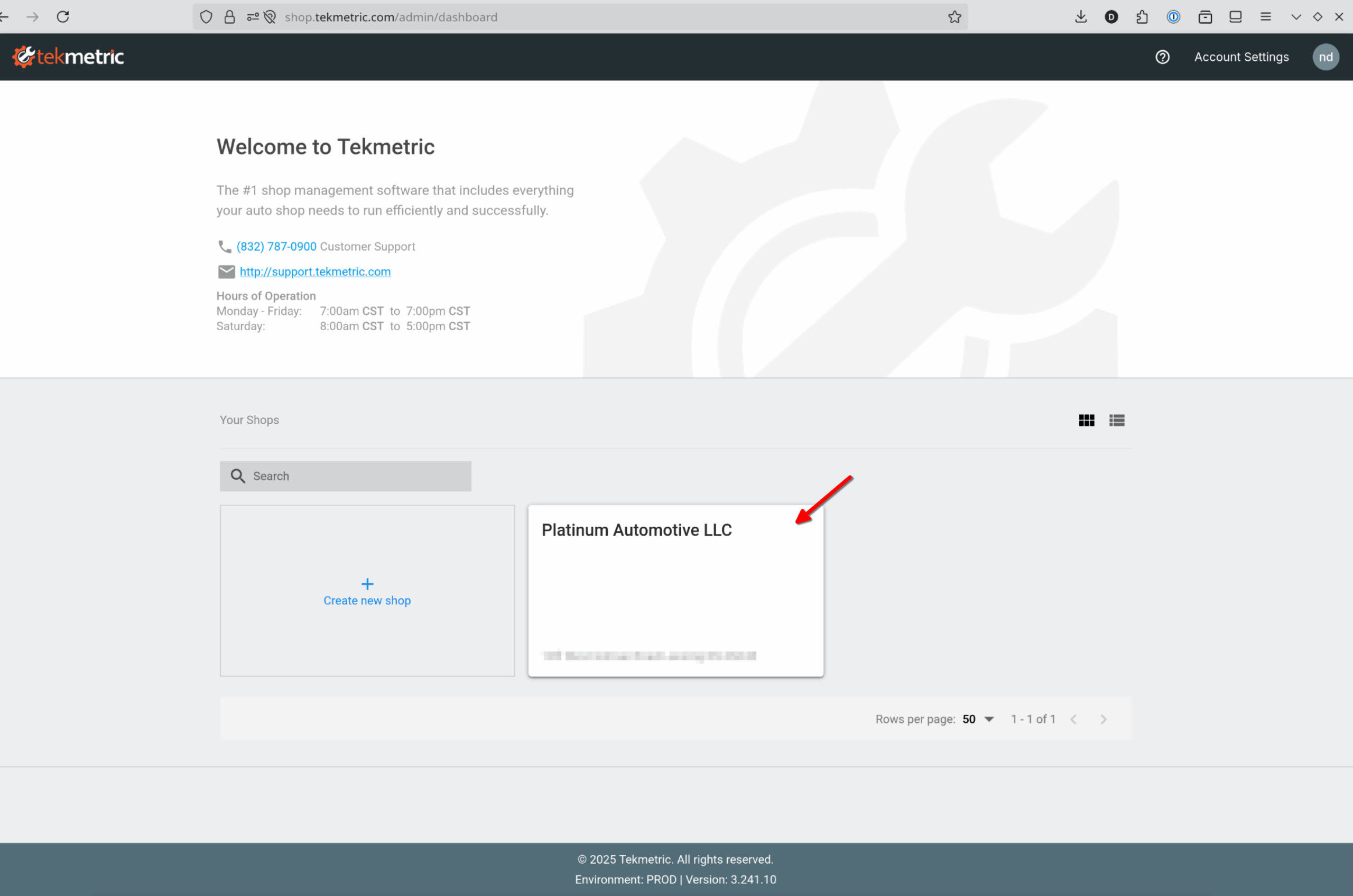 - On the “Welcome to TekMetric” screen, click on the shop you would like Binny to collect order data from.