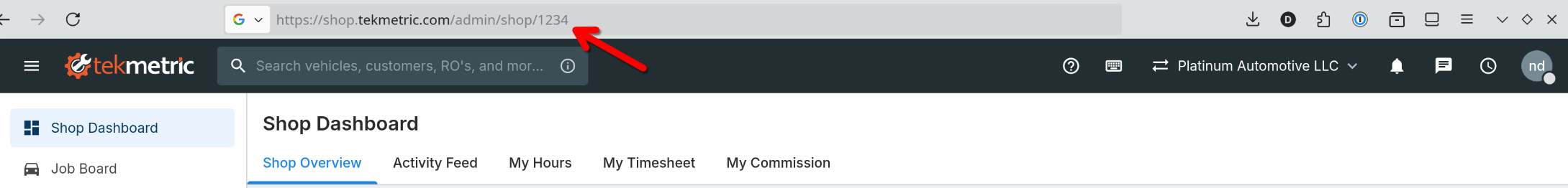 - “https://cba.tekmetric.com/admin/shop/1234” -> Shop ID is 1234